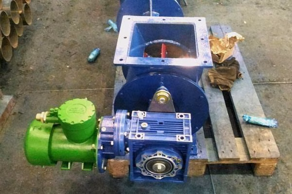 Питатель шлюзовый во взрывозащищенном исполнении из нержавеющей стали производительностью 3 м3/час. Материал транспортиро-вания угольная пыль. Входной фланец Ø150 мм, выходной фланец 200х200 мм.